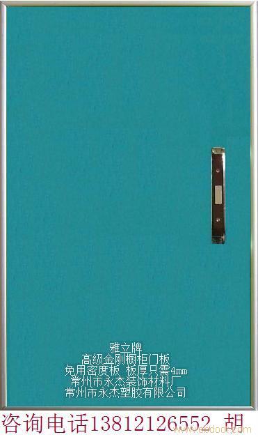 常州市永杰装饰材料厂生产的EOP特种金刚柜门板是一款代替钢化玻璃贴膜工艺的一代产品,完全避免了外出加工贴膜、玻璃钢化等繁琐程序和运输破损率高、贴膜起泡、交货期不稳定等诸多弊端。这种新型门板面如镜、硬如钢、耐酸碱、阻燃型(离火自息)、防霉变、防虫蛀、100%防水,有18种玻璃钢胶加工成的流行色(单色、闪点任意选择),板厚只需4.2-4.3mm,只要插在带有4.5mm槽口和转角件的铝合金封边框就能组成一个高贵华丽的柜门板,不用螺丝不用胶,四八尺大板裁切随心所欲、这种门板加工方便、操作简单、可锯可刨可钉可钻可粘。而且裁切下来的边料不要浪费,可以制作小样分发给你的分销商和客户。该新颖门板主要用于橱柜、衣柜、浴柜、书柜、隔断、场所装饰贴面之用,并能广泛用于化工、石油、电镀、矿山、医药、电子、通讯和水净化处理设备、环保设备等行业。总经理亲自掌控饰面设计、生产管理、成本控制。产品质量、价格均得到客户的一致认同和好评,使用该产品具有经久不衰的竞争力。欢迎来人来函洽谈,咨询敬请联系胡总  好产品尽在www.czyjzs.com